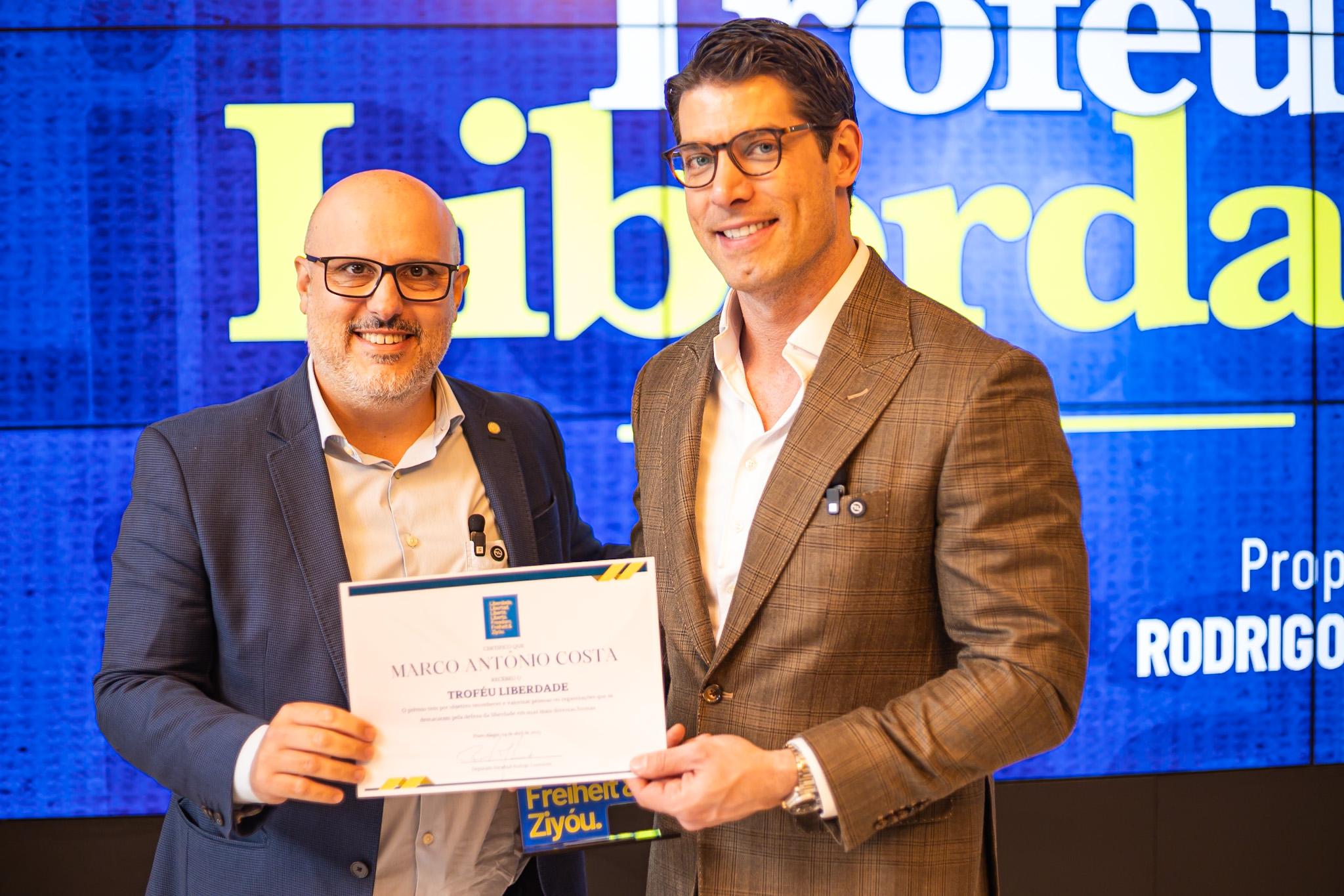 Para Rodrigo, Marco, com sua voz firme, forte e corajosa, é um dos líderes desse processo em que as redes sociais são fundamentais para a defesa do nosso país. “Esse troféu é um reconhecimento a tua coragem e ao teu trabalho, mas é também um pedido: não para, não precipita e não retrocede”, disse o deputado.