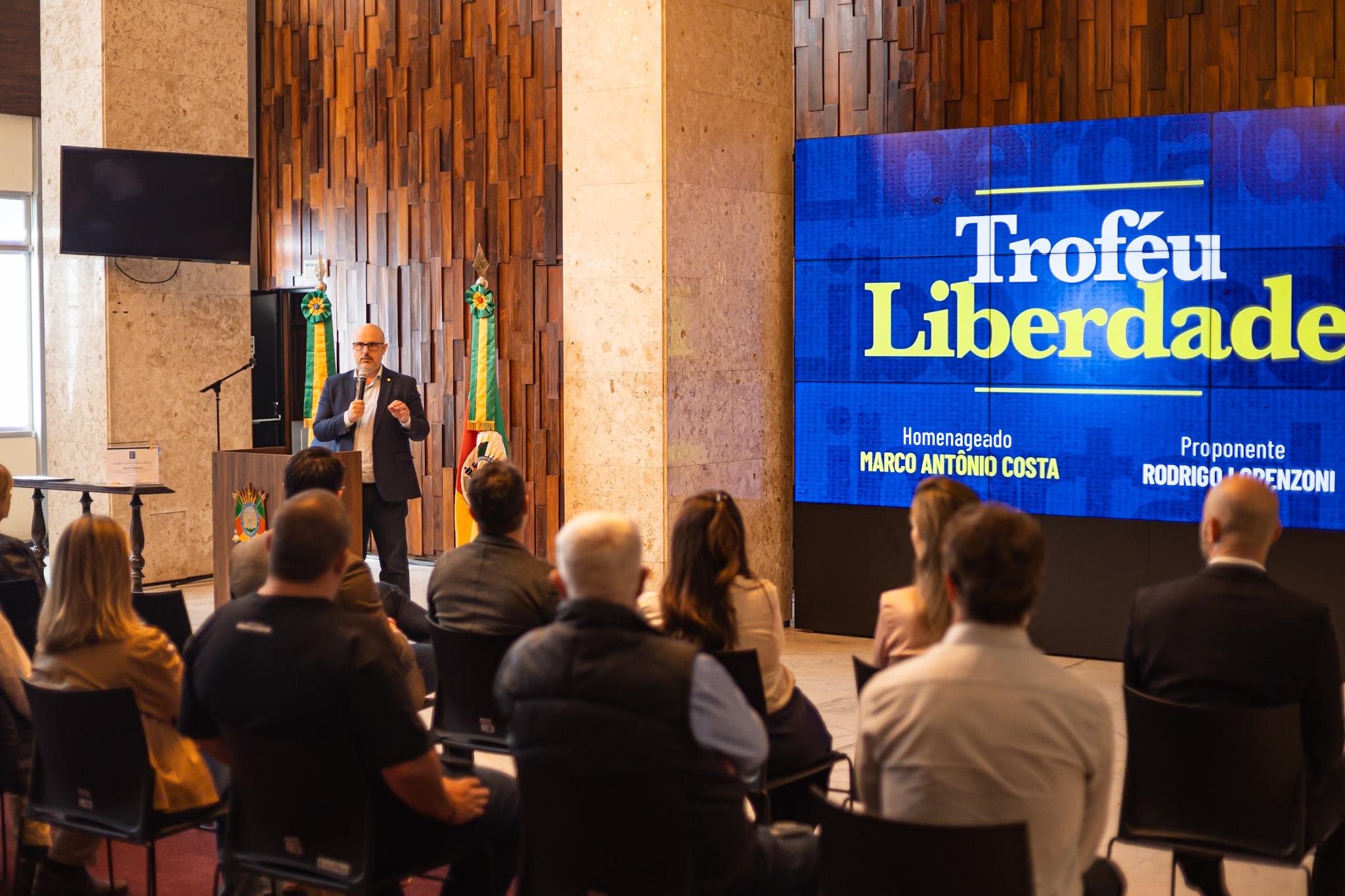 Nesta sexta-feira (04/04), foi realizada no Salão Júlio de Castilhos da Assembleia Legislativa do RS a solenidade de entrega do Troféu Liberdade ao advogado, comentarista e apresentador do programa Fio Diário Marco Antônio Costa.