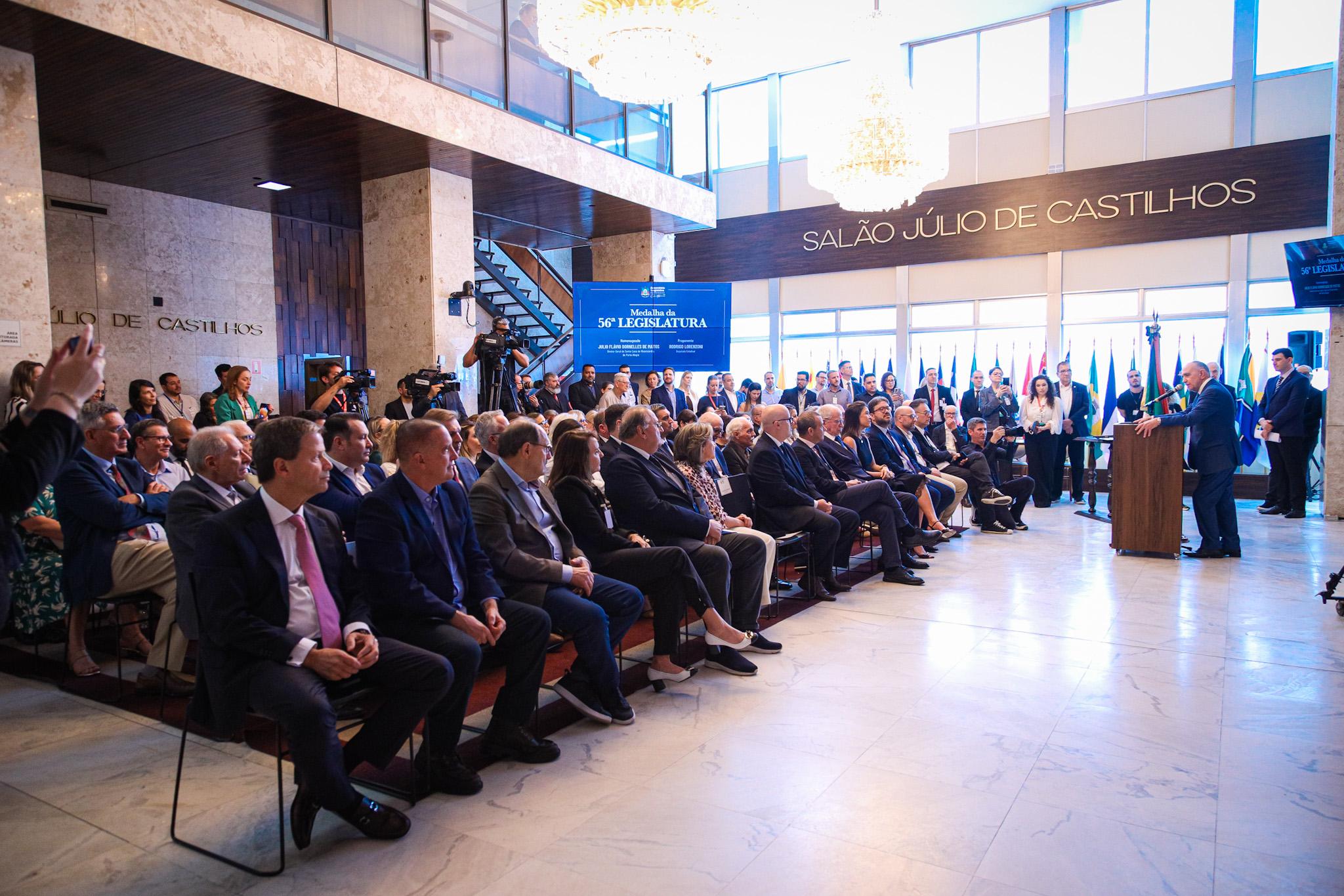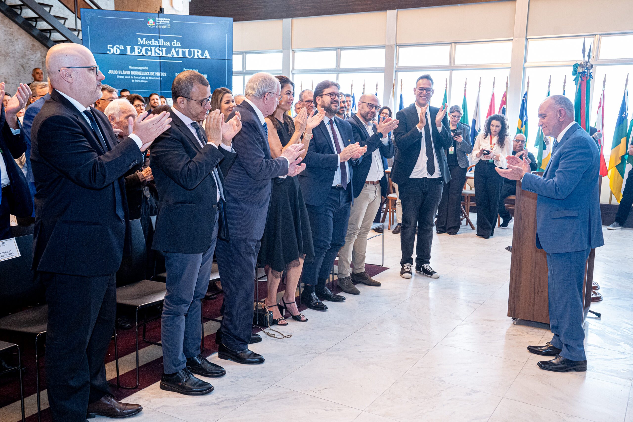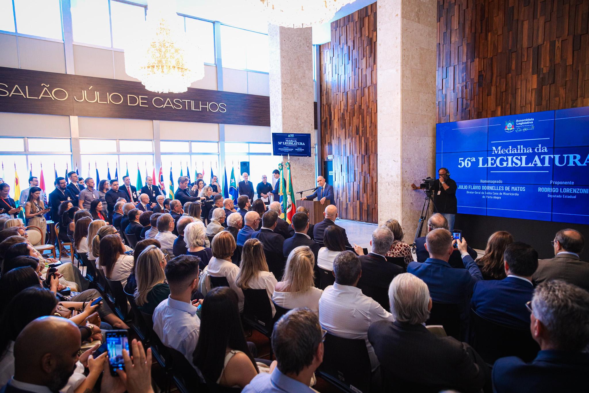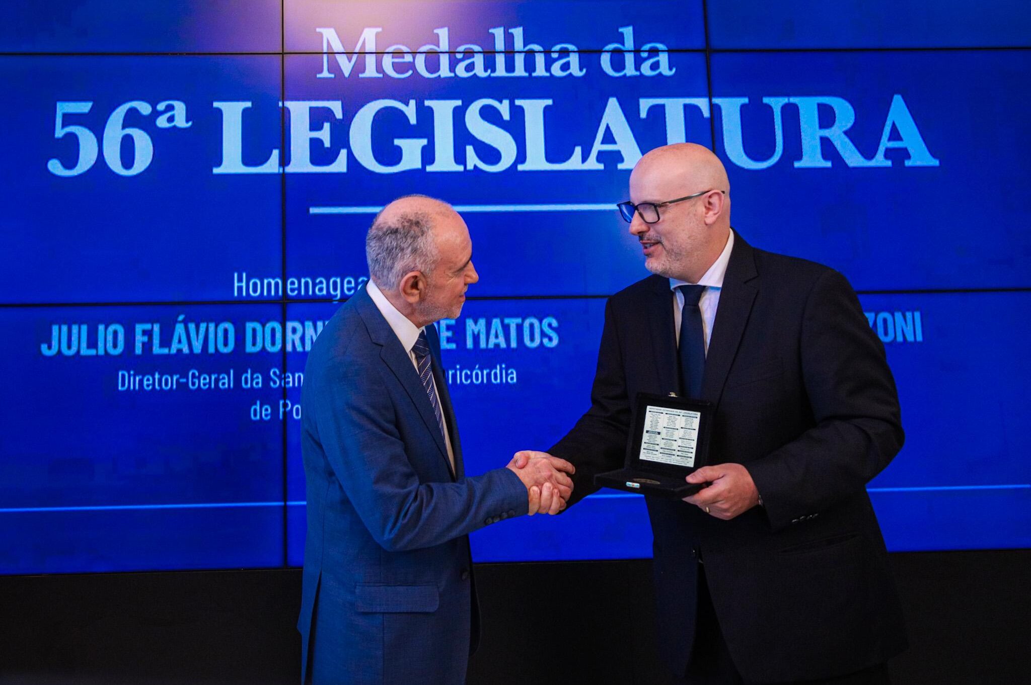 Por iniciativa do deputado Rodrigo Lorenzoni, a Assembleia Legislativa entregou, nesta sexta-feira (14), a Medalha da 56ª Legislatura ao diretor-geral da Santa Casa de Misericórdia de Porto Alegre, Julio Flávio Dornelles de Matos. A honraria é uma das mais relevantes do Parlamento gaúcho e reconhece personalidades que prestam serviços de grande impacto ao Rio Grande do Sul.