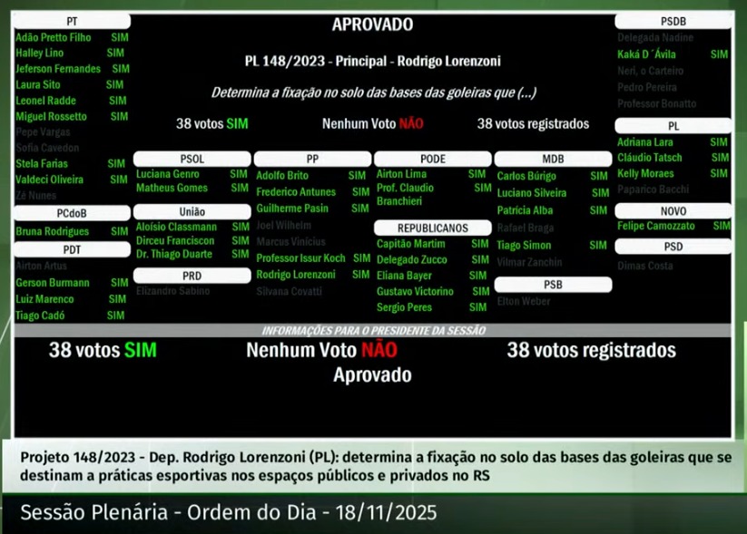 O plenário da Assembleia Legislativa aprovou, nesta terça-feira, o Projeto de Lei 148/2023, de autoria do deputado Rodrigo Lorenzoni, que determina a fixação no solo das bases das goleiras utilizadas em práticas esportivas, tanto em espaços públicos quanto privados no Rio Grande do Sul. A proposta foi aprovada por 38 votos favoráveis e nenhum contrário.