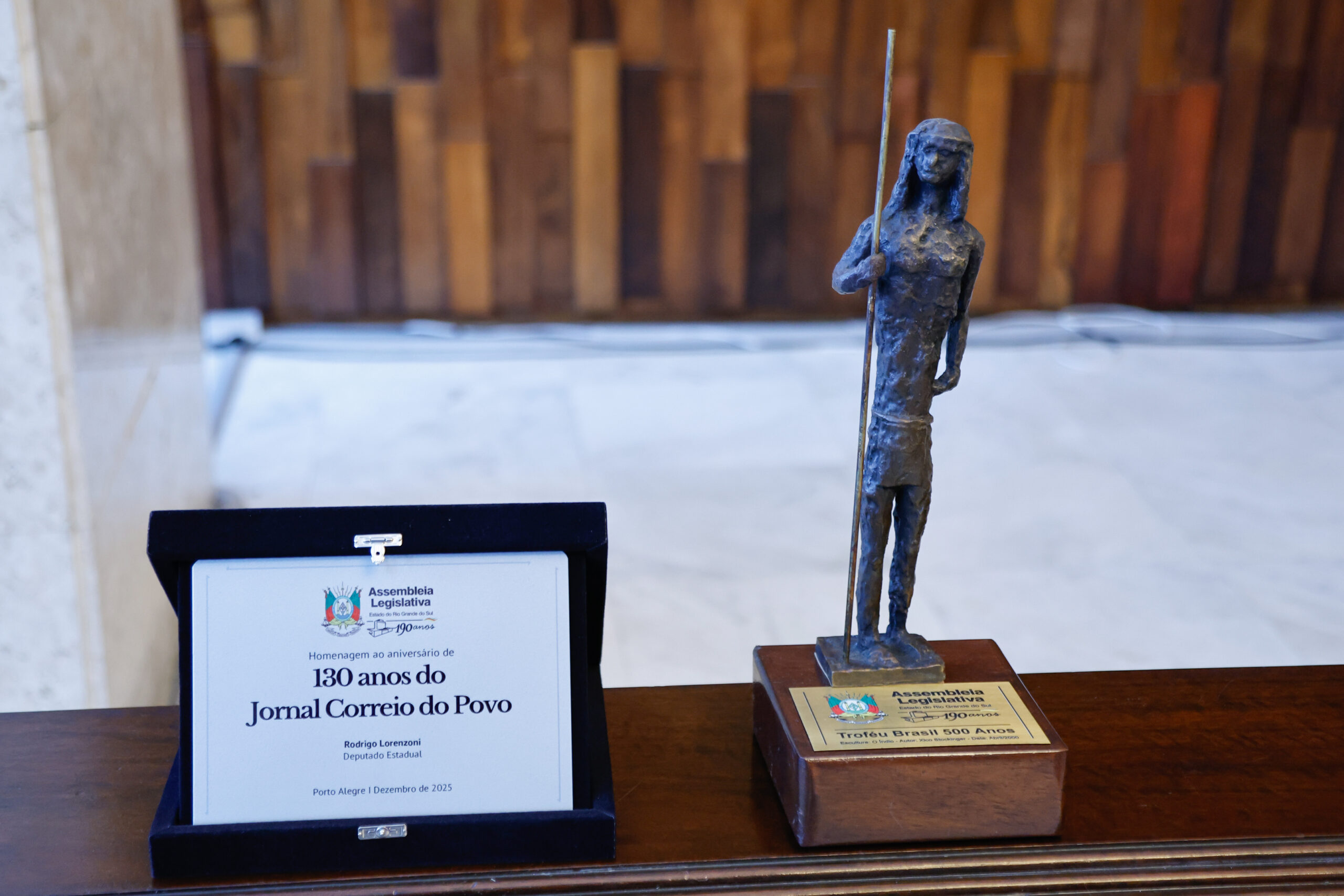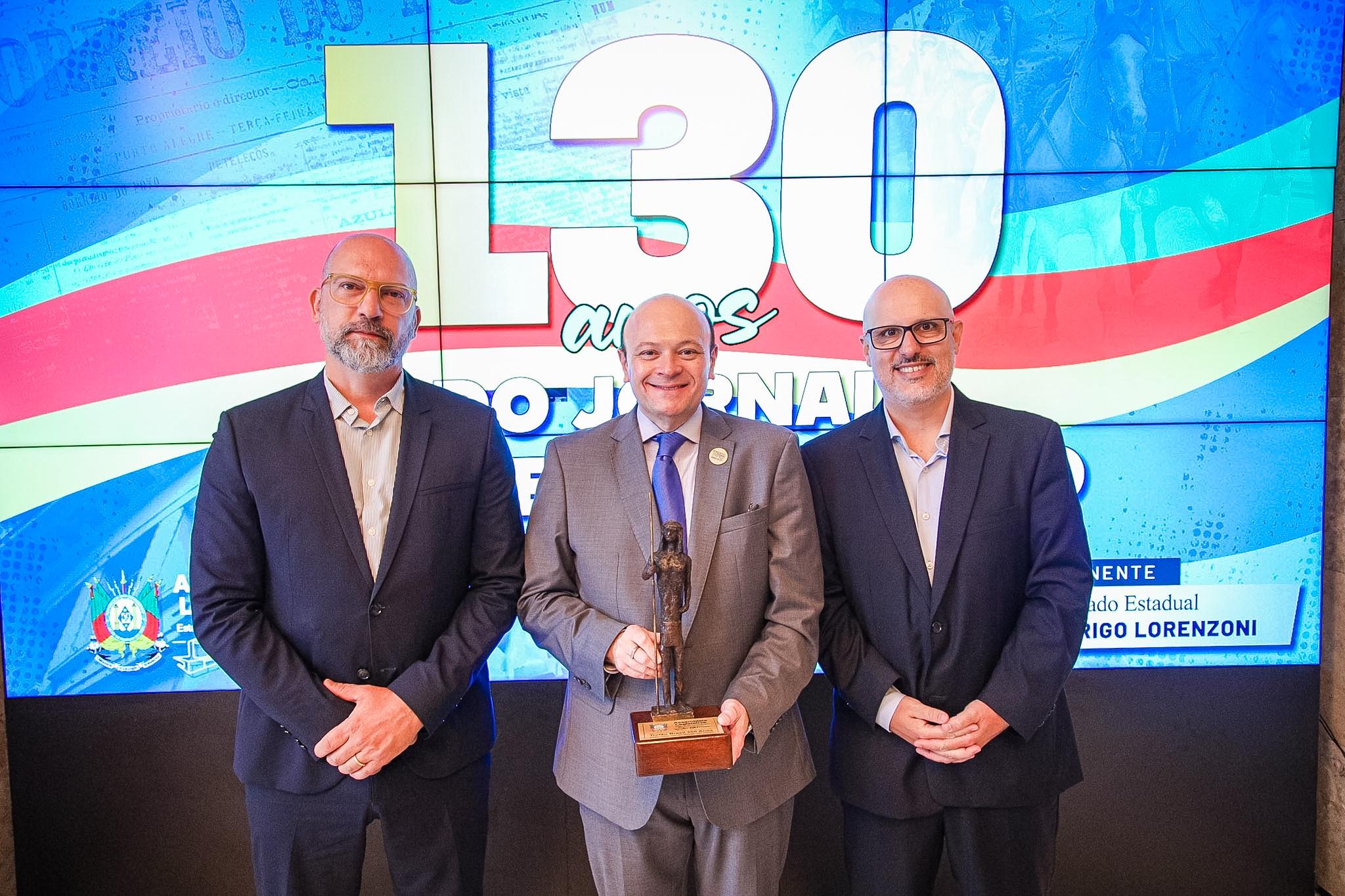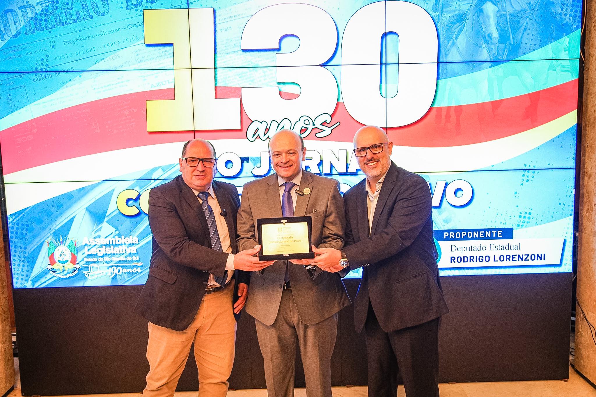 A Assembleia Legislativa realizou, nesta quarta-feira (10), cerimônia em homenagem aos 130 anos do Correio do Povo, um dos veículos mais tradicionais e influentes do Rio Grande do Sul. A iniciativa foi proposta pelo deputado Rodrigo Lorenzoni, que entregou ao diretor-presidente do jornal, Marcelo Dantas, uma placa alusiva à data. Representando a Mesa Diretora, o deputado Sérgio Peres, presenteou o jornal com o Troféu Brasil 500 Anos, obra do escultor Xico Stockinger. Dantas, por sua vez, presenteou a ALRS com duas capas do periódico, marcando momentos simbólicos da trajetória institucional da Assembleia.