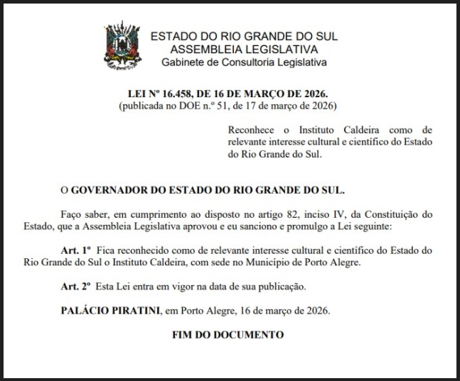 A Lei nº 16.458, de 16 de março de 2026, de autoria do deputado estadual Rodrigo Lorenzoni, que reconhece o Instituto Caldeira como de relevante interesse cultural e científico do Rio Grande do Sul, foi sancionada e já está em vigor desde sua publicação no Diário Oficial do Estado em 17 de março de 2026.
